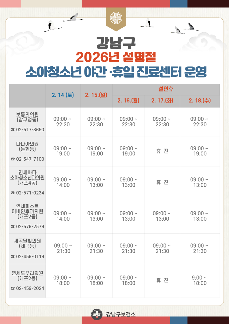 2026년 설명절 소아청소년 야간 휴일 진료센터 운영 안내